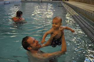luke went for his very first swim this afternoon at the indoor pool at our gym during family swim time! we just kept telling him it was a giant bathtub (he loves the bath!). too bad the water wasn't as warm as it is at home. he did enjoy it, even the dunk his momma gave him!